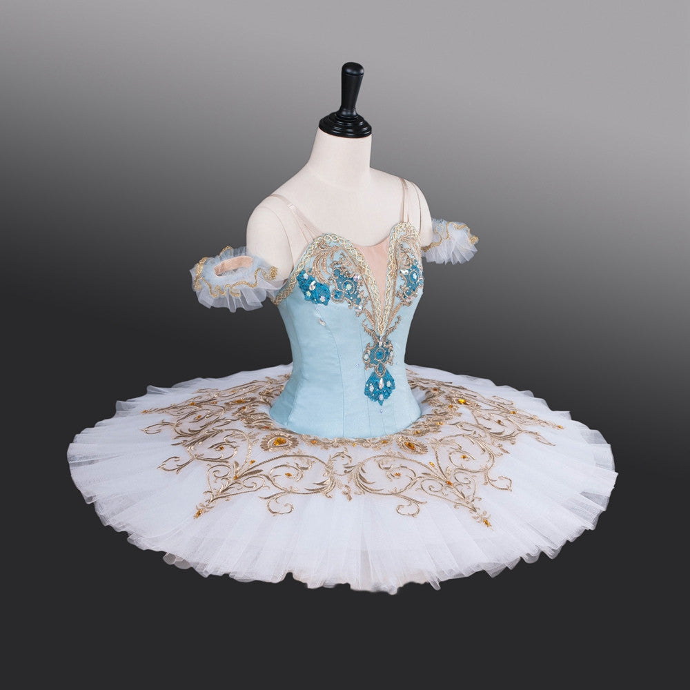 This Cinderella pale blue and white professional tutu is a real princess costume. Suitable for many roles, like "Raymonda", "Princess Aurora", "The Snow Queen" and many other, this is refined and rich at the same time. The pale blue professional fitted bodice has been created with a special semi-stretchy fabric and features a deep V cut in the front with a nude mesh insert. The bodice is embroidered with golden trims and deep blue appliques, blue and clear crystals.
