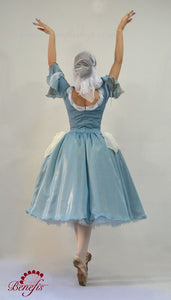Two rows of hooks on the back of the bodice. Decoration: lace, braids and satin ribbons. The Romantic tutu skirt consists of six layers of soft and hard tulle, made in a variety of lengths. Tulle panties. The panties are connected to a yoke (7 cm) of tulle attached to an elastic waistband.