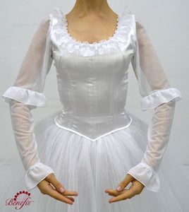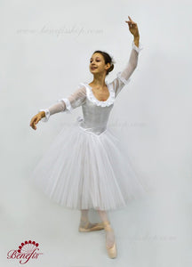 The tutu skirt is made according the basics of a Romantic tutu, and features 5 layers of very soft net, and a satin big bow that ties in the back.