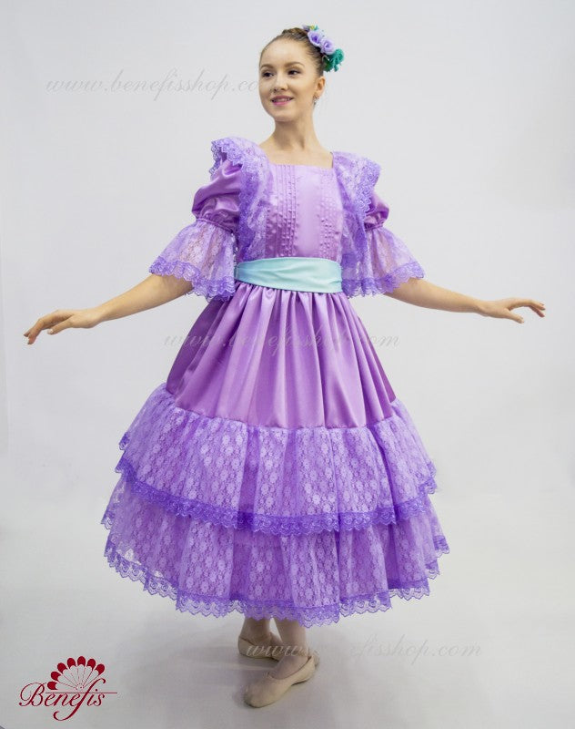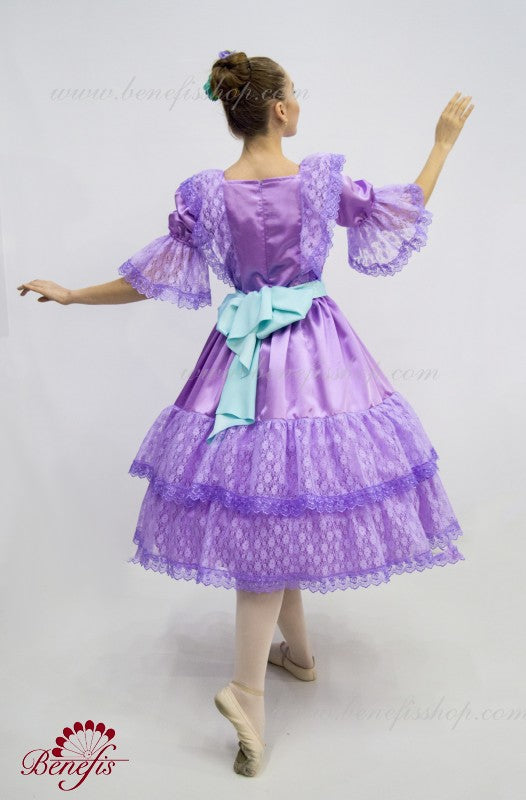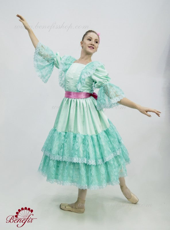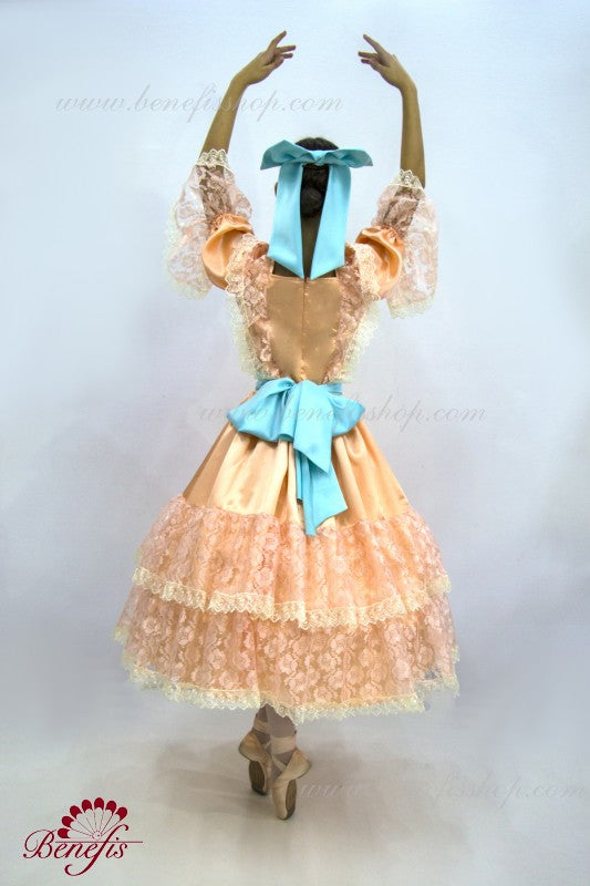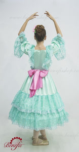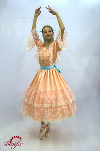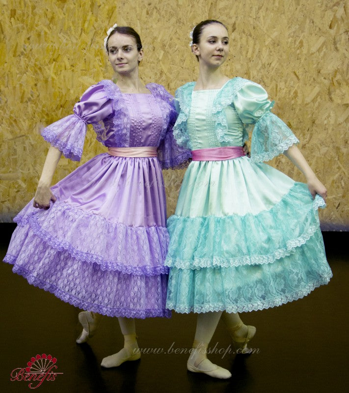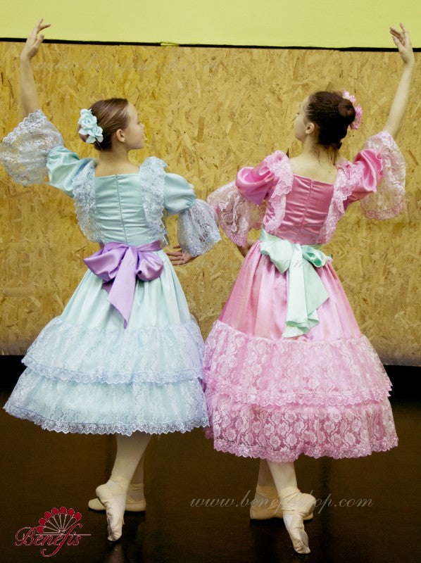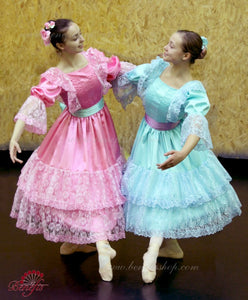 Dress and bow. This is a ballet stage costume for the role of Clara in the Nutcracker. Made of semi-stretchy, dense, shiny fabric. The puffy sleeves and ruffles are finished with lace. The bodice fastens at the back with a zipper. The crinoline rings add a splendor to the skirt.