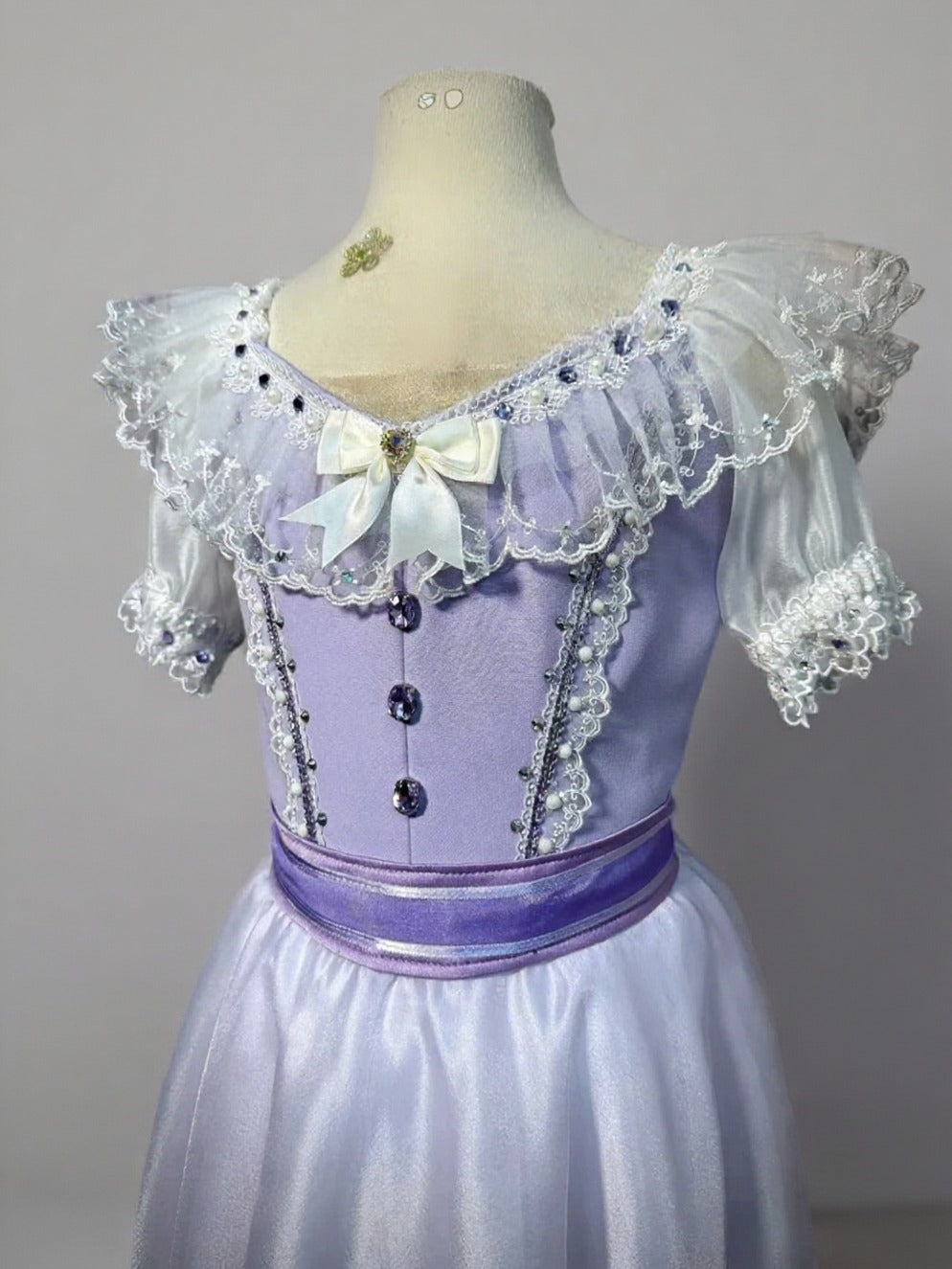 This elegant dress is made with created in a lovely shade of pale lilac. Round neck lilac top part, with rich white lace decorations, crystal buttons, bows, white three-quarter sleeves, and a wide lilac sash ending with a big bow in the back.