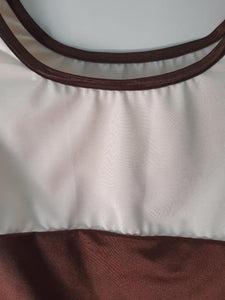 Coffee and Cream is one of our newest 2021 leotards. Created with two lovely colors: coffee brown and creamy beige. Coffee and Cream features a round boat neck front and back, and short sleeves with contrasting rims.