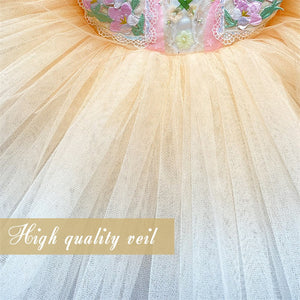 One of our newest styles for the role of Coppelia. This professional, pancake peasant tutu features a peach bodice entirely embroidered with flower appliques, sparkles, pink and white lace, and the typical laced pattern with white undershirt and short lace sleeves.