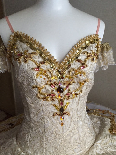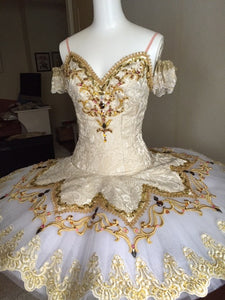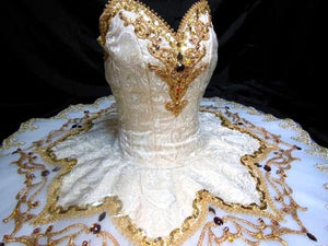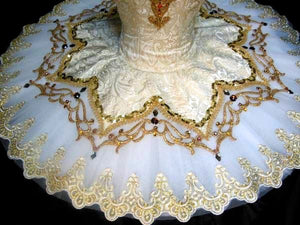 The professional tutu skirt is white and slightly bell-shaped. It features lavish gold decoration and, embroideries and appliques. Arm bands included.