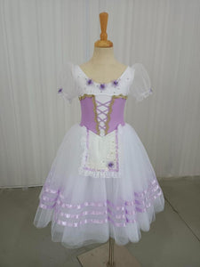 The pale lilac corset and the white bodice underneath, features with short, tulle puffy sleeves, lilac flower appliques, and a laced motif with lilac ribbons and god trims.