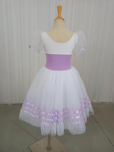 The peasant, mid calf Romantic skirt is white, beautifully embellished with three rows of lilac satin trims, and an embroidered white apron.
