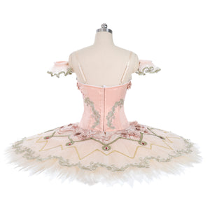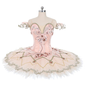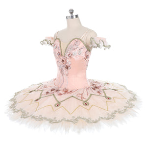 A stunning, professional stage costume can be worn for the role of "Coppelia" but also for Princess Aurora in the ballet "Sleeping Beauty", for "Sugar Plum Fairy" in Nutcracker and for other repertoire variations. The pale pink satin bodice features a delicate floral pattern, a nude inset, gold and pink trims and sequins. Hooks and eyes are in the back for a perfect fitting. The pink, 10 layers tutu skirt is richly decorated with gold trims, appliques, stones and sequins. Arm ruffles included.