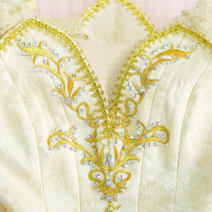 This custom made professional tutu features a pale peach brocade bodice with a deep nude insert and rich decoration with god appliques and crystals. Lace cap sleeves.