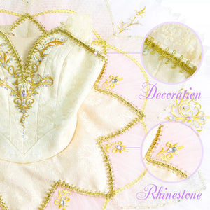 The professional tutu skirt features 10 layers of the finest white net and is embellished with gold appliques, and crystals. First layer made with glittery tulle.