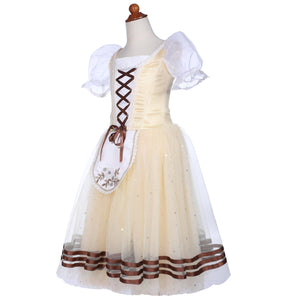 The very light and fluffy Romantic skirt features a pale peach shade of color, with a cute white apron with a floral pattern and brown ribbons embellishing the skirt and completing the sweet peasant look of this very feminine costume.