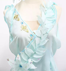 This crossed pattern, minty blue short dress is made with chiffon, and is decorated with aqua blue shiny sequins, gold appliques, blue and clear crystals, and an impressive trail of flowers across the chest. The same flowers are also included in form of headpiece.