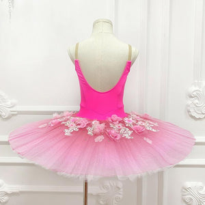 The slightly bell shaped tutu skirt is white underneath, with an organza overlay featuring gradient tones of rose pink and also richly decorated with flower appliques.