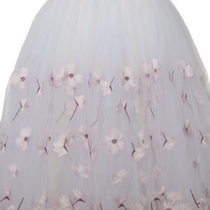 The Romantic skirt is white and has different rows of pink ribbon and pink appliques.