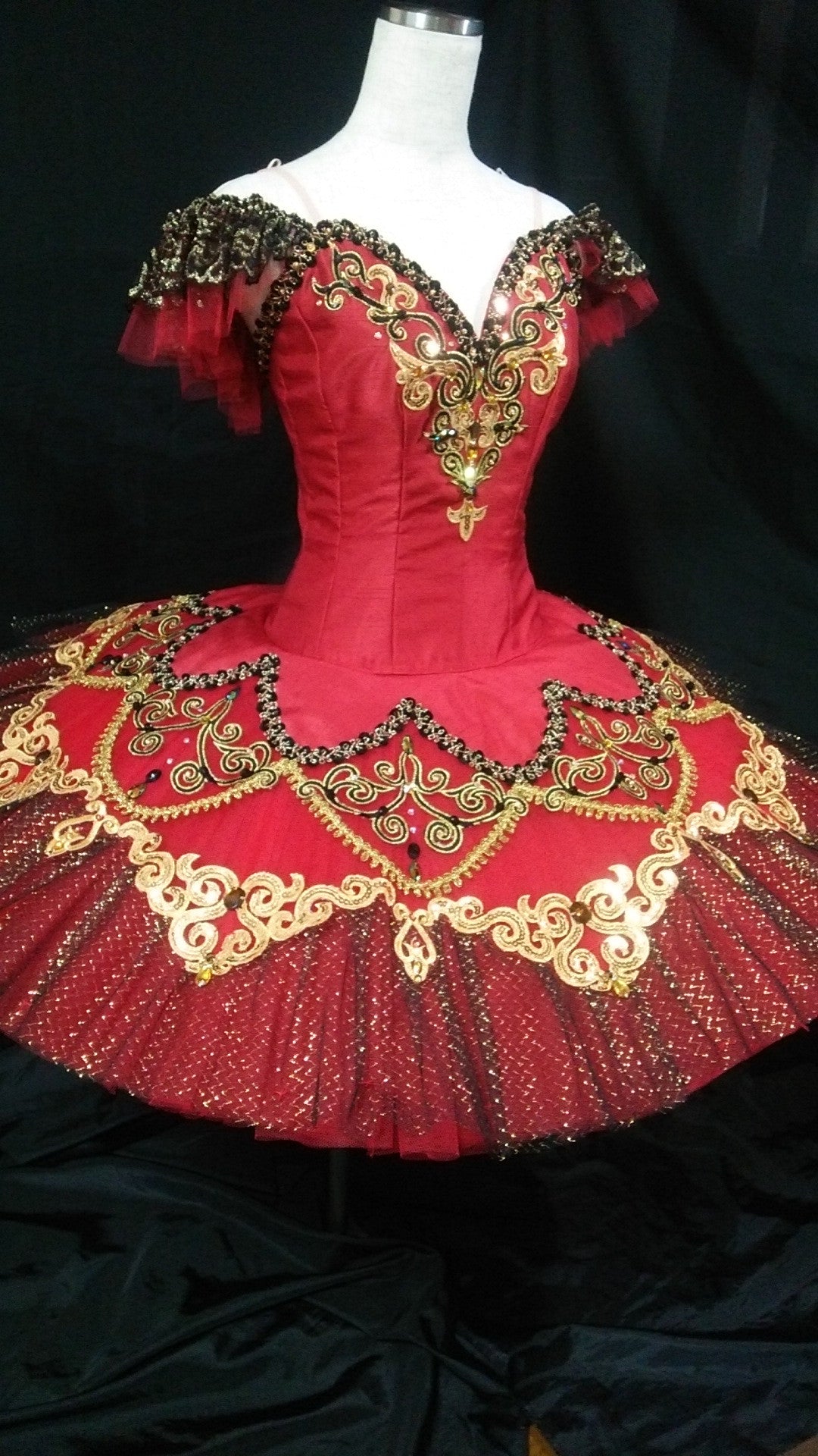 Deep Red Scarlet is one of the our best Don Quixote costumes. Created for any Spanish role as Kitri or Paquita, this tutu will attract the attention of the audience with its perfect cut and amazing decoration.