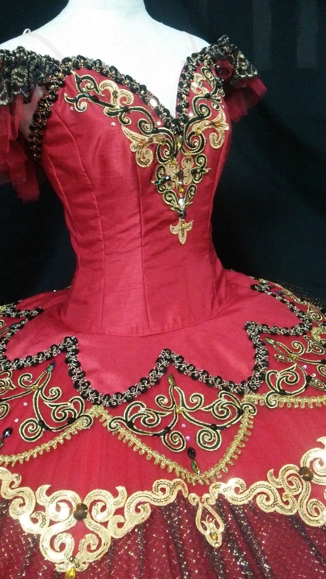 The bodice is made with deep red silk shantung and features a deep V central motif. The bodice is richly decorated with gold appliques, black trims and crystal stones. The sleeves gently slope down from the shoulder and are made of two different materials: black lace and red net. The red tutu skirt is bell-shaped and features a small, flower-shaped red shantung overlay. The tutu skirt has been decorated with black and gold trim, gold appliques and crystals. There is a shiny black and gold layer of net on the edge of the skirt, adding extra shiny to this professional stage costume.