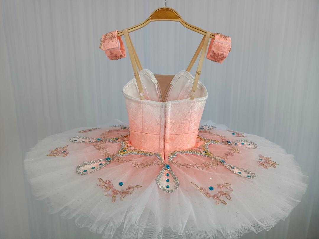 The bodice is made with pink jaquard fabric, with pink ace inserts, silver trims and blue crystals. The bodice, as well as the tutu skirt, are ombre' dyed, and feature a gradient pink color. The ten layers tutu skirt is decorated with silver trims, pink appliques, and blue crystals.