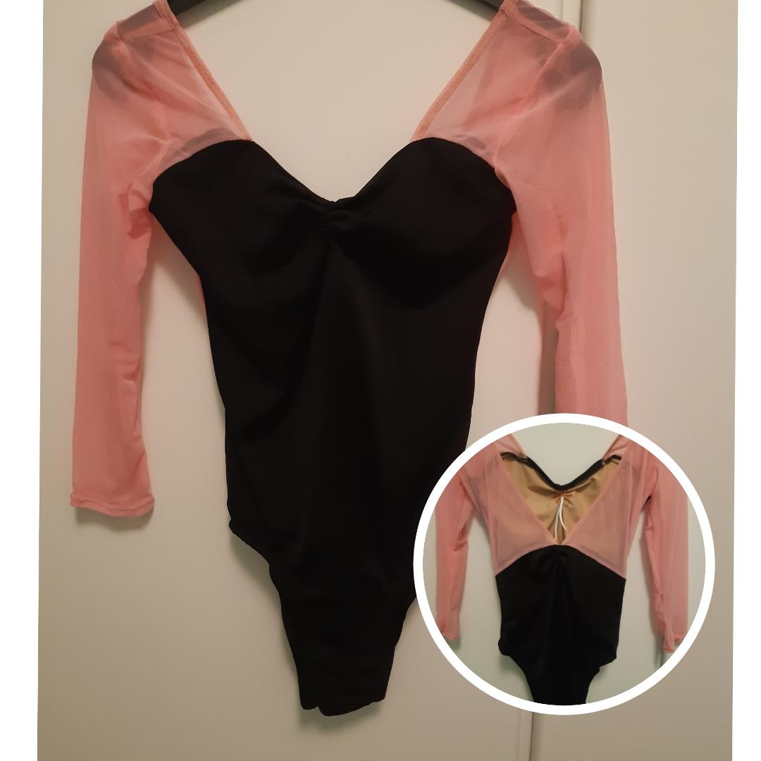 New 2021 creation! This long sleeves black leotard features pink mesh sleeves an back. Sweetheart neck with a lovely pinch with adjustable string in the front, and also a cute pinch at the bottom of the back.