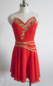 The short dress is made with a vivid shade of red chiffon and is entirely decorated and embroidered with gold sequins, sparkles, gold appliques and Swarovski stones.