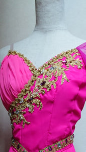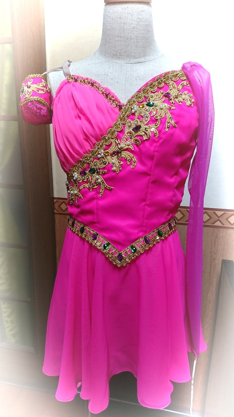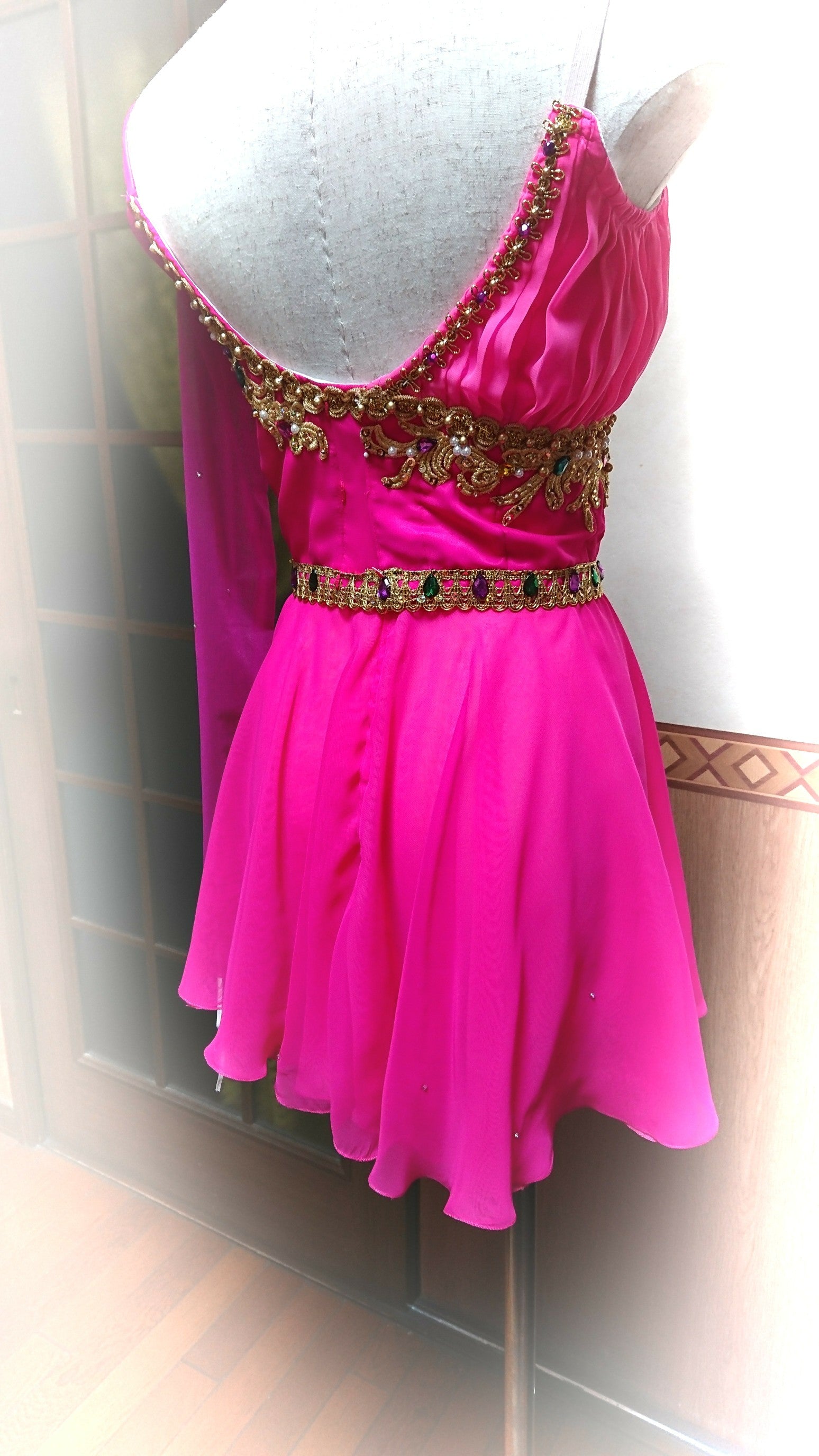 The short dress is made with silk hot pink chiffon of the highest quality, and feature a softer tone of pink in the bottom layer of the skirt, a darker pink scarf on the left shoulder, and one gold arm bracelet.