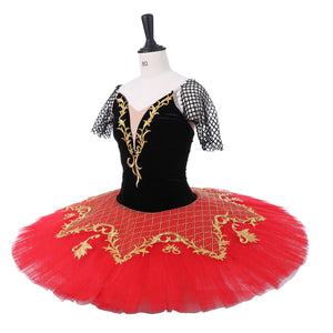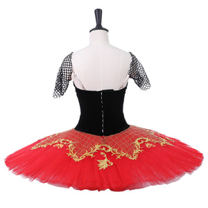 The professional velvet black bodice is decorated with precious gold appliques,  and features a nude net short sleeves. The bright red tutu skirt features a small overlay made of golden net, and richly embroidered with gold appliques.