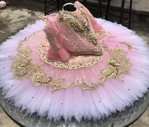 The tutu skirt, very soft and slightly bell-shaped, features the "ombre dying" colors or fading colors. The deep pink color fades to a softer shade of pink. There is a small overlay made of golden lace,  and the skirt is also embellished with dark gold appliques, crystals and pearls.