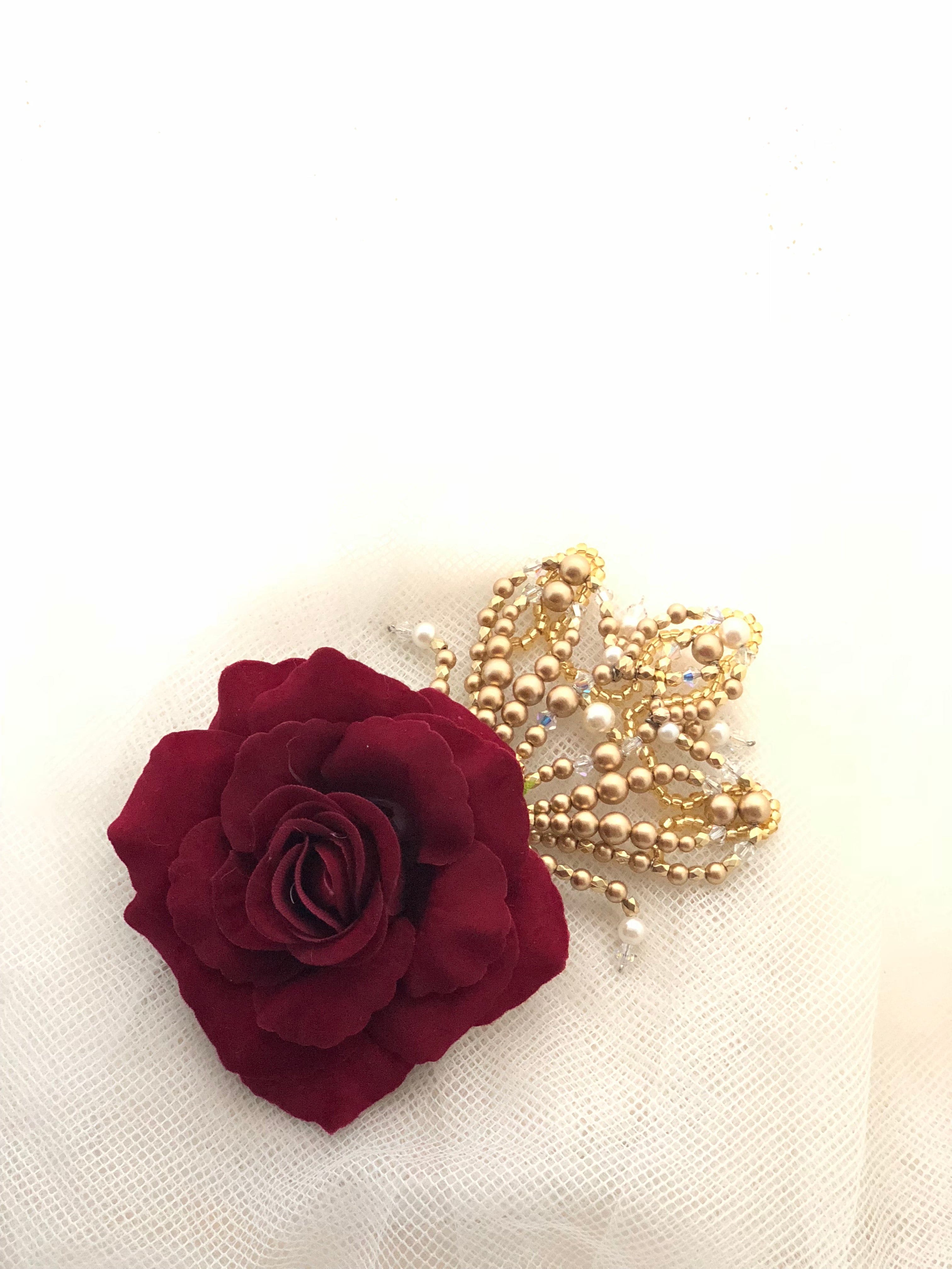 This wonderful professional headpiece for the role of Kitri is a combination of a stunning silk red rose, and a golden comb decorated with sparkles.