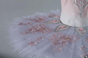 The white, 10 layers pancake tutu skirt is decorated with pink lace appliques, pink flowers and silver sequins.