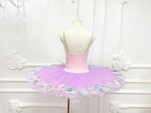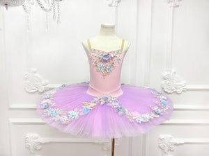 Very elegant child pre-professional pull-on tutu suitable for Spring recitals. The V-shaped bodice is made with lilac elasticized fabric and features very rich floral decoration. The pancake skirt is lilac, embellished with satin flowers.
