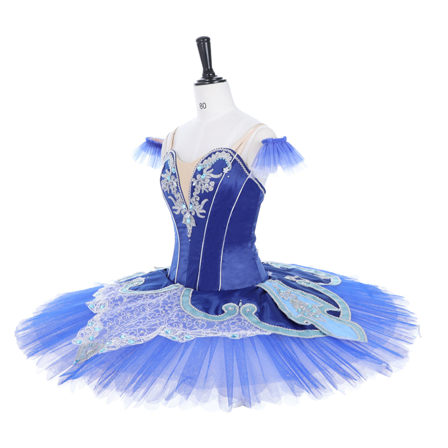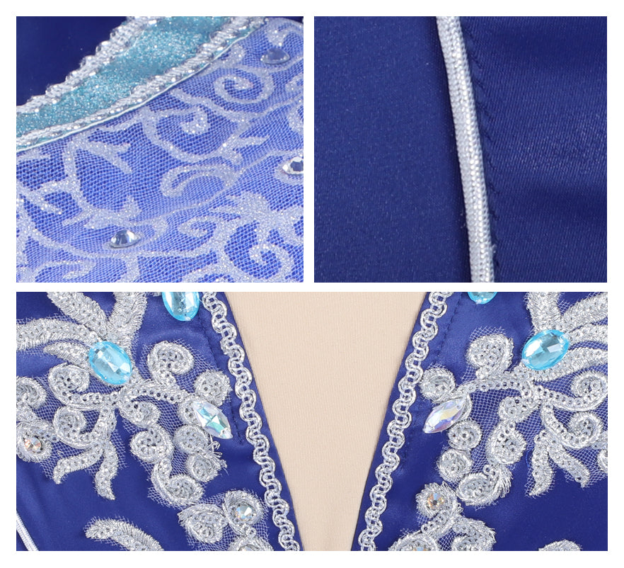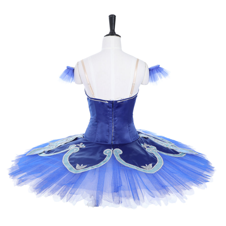 The 10 layers professional tutu skirt, features a matching shade of blue tulle. Embellishments on the tutu skirt were sewn all around the skirt, using the same blue appliques of the bodice, various silver trims, blue crystals and white lace.