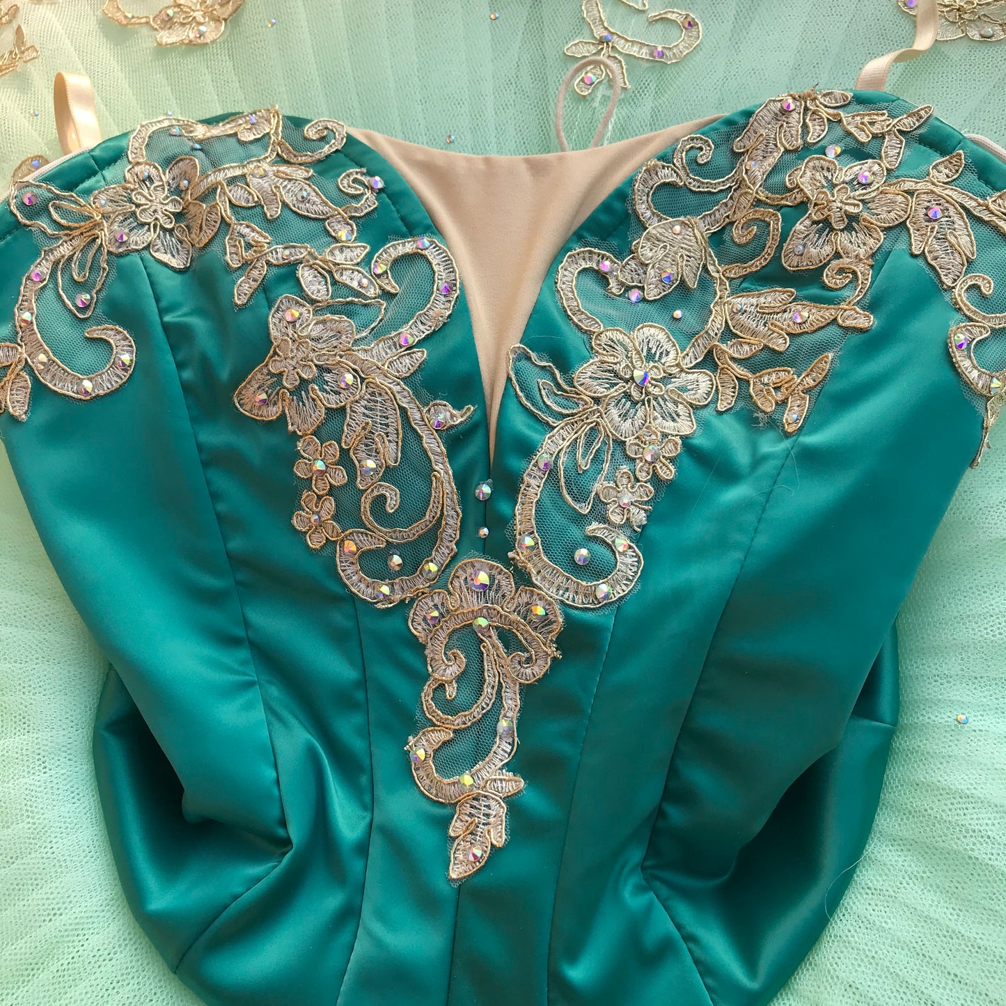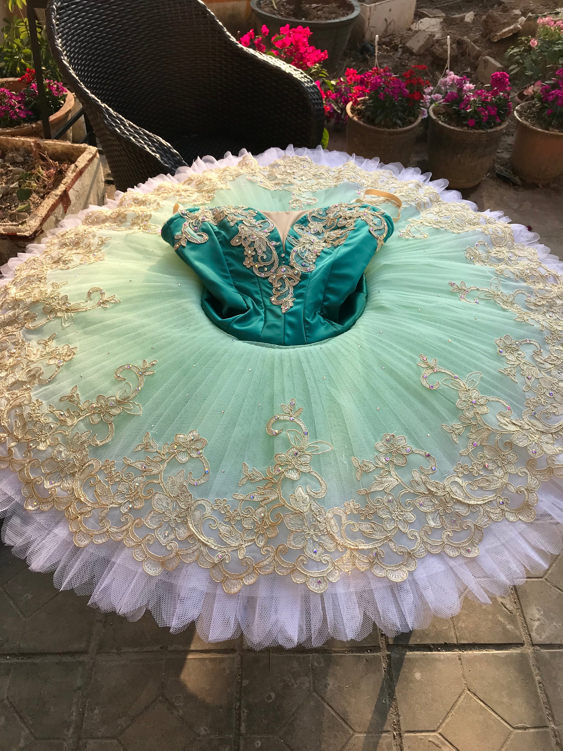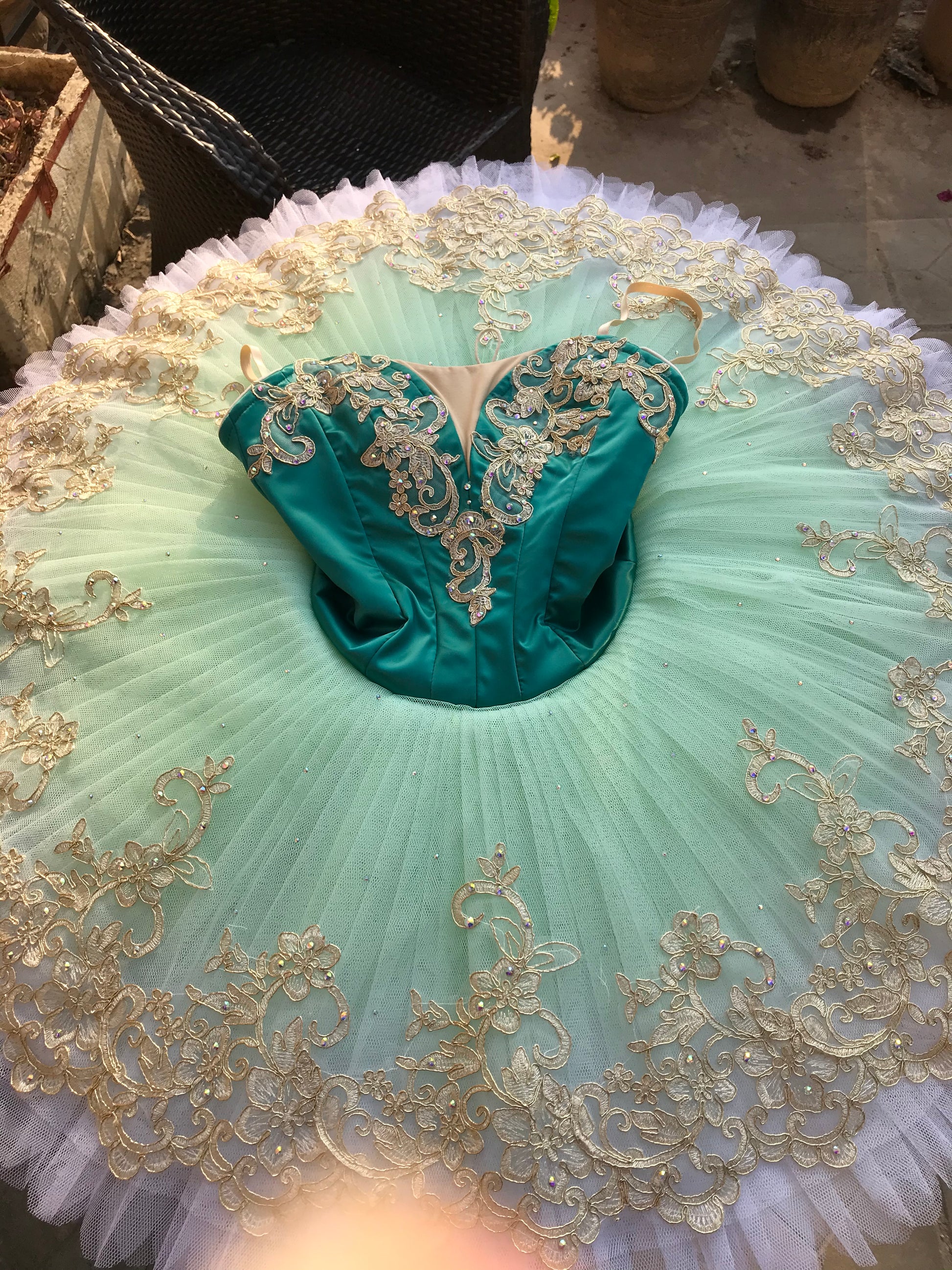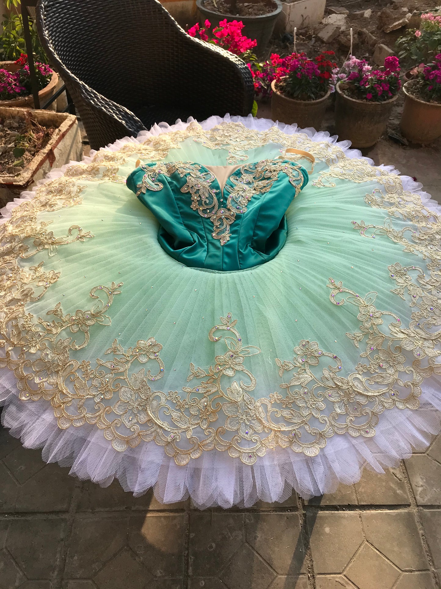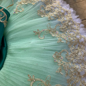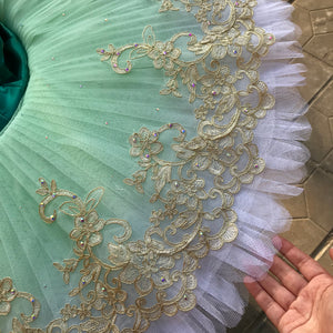 The 10 layers, professional tutu skirt is white, with a pale aqua green overlay and elegant gold lace appliques, as well as crystals.