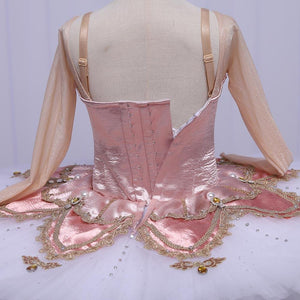 The bodice style is very original, with a rounded top, and mesh nude long sleeves attached to the clear straps. The bodice is made using a special semi stretchy shiny fabric, in a dusty shade of pink. The top part of the tutu bodice is richly decorated with gold appliques and crystals, and there is a central jewel in the middle of the chest.