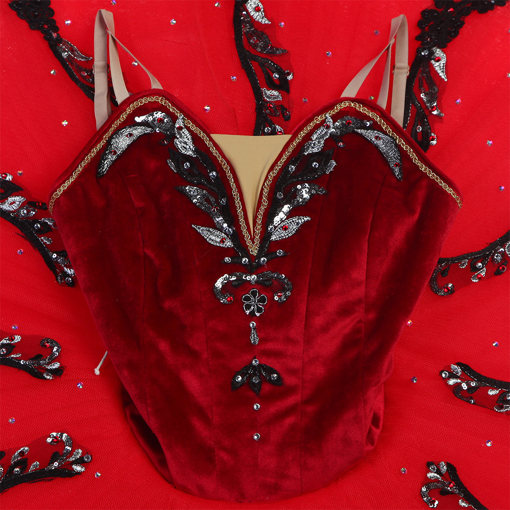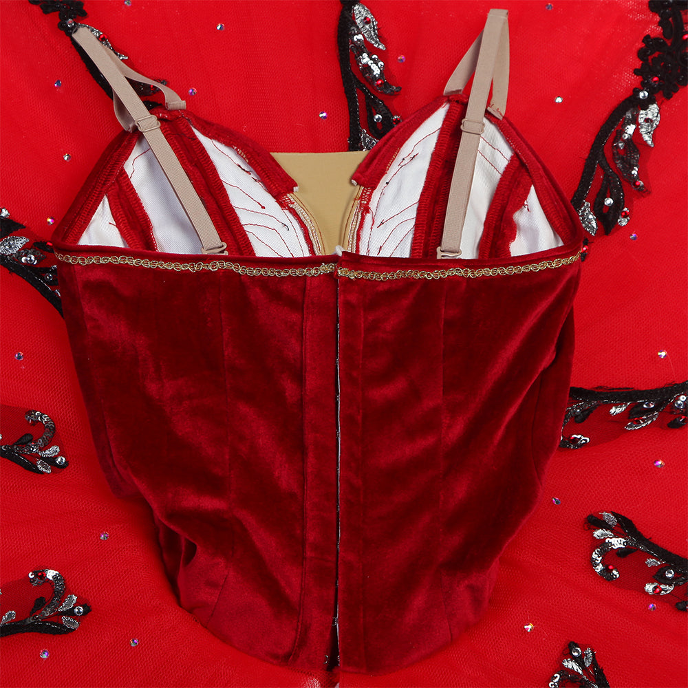 The bodice of this professional tutu was created using a beautiful deep red color velvet. It features a deep V in the front and  a nude insert. Decorations on the bodice have been made using silver and black trims and sequins, sparkles and beads. The bodice fastens in the back using two rows of hooks and eyes. An elasticated cord built in the top part of the bodice assures a perfect fir. Red, matching tulle arm are included in this costume.