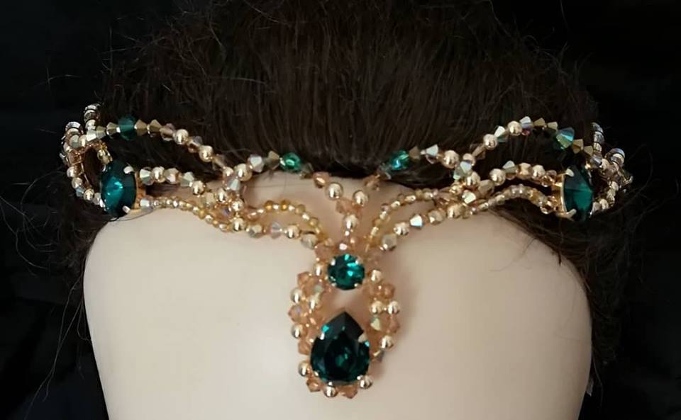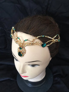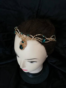 Wonderful headpiece for the role of "Esmeralda". Features a gold frame, green stones and emeralds, the effect is absolutely stunning.
