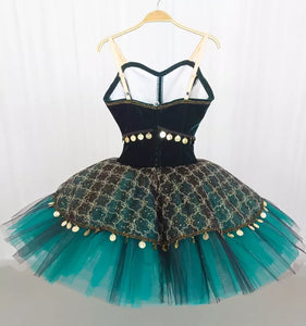 The bodice is made with black, high quality velvet and features decorations with golden and black trims, and golden coins. The bell-shaped tutu skirt is green with some black accents,, decorated with a shiny black and gold overlay and multiple golden coins.