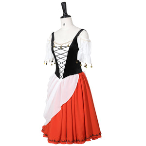 The professional bodice is black,  and features a very flattering deep V cut in the front, with a white undershirt, a laced pattern, and gipsy golden coins. White, three quarter sleeves are attached to the nude straps and are decorated with golden coins.