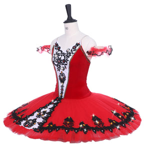 The professional tutu skirt is red, with 10 layers of hand tucked high quality tulle. The skirt is richly decorated with black appliques and crystals, and features a white insert in the middle, matching the bodice.
