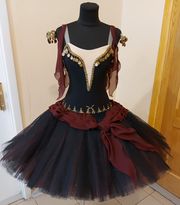 The professional, bell shaped tutu skirt is black , decorated with a burgundy chiffon scarf, making this costume a unique tutu.