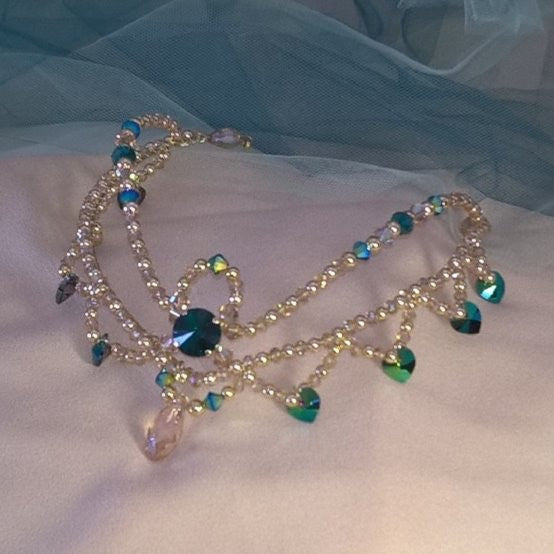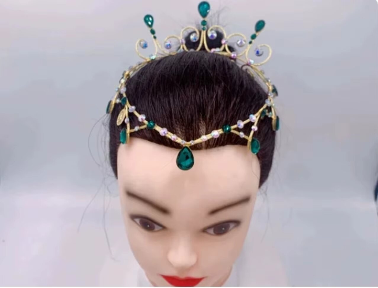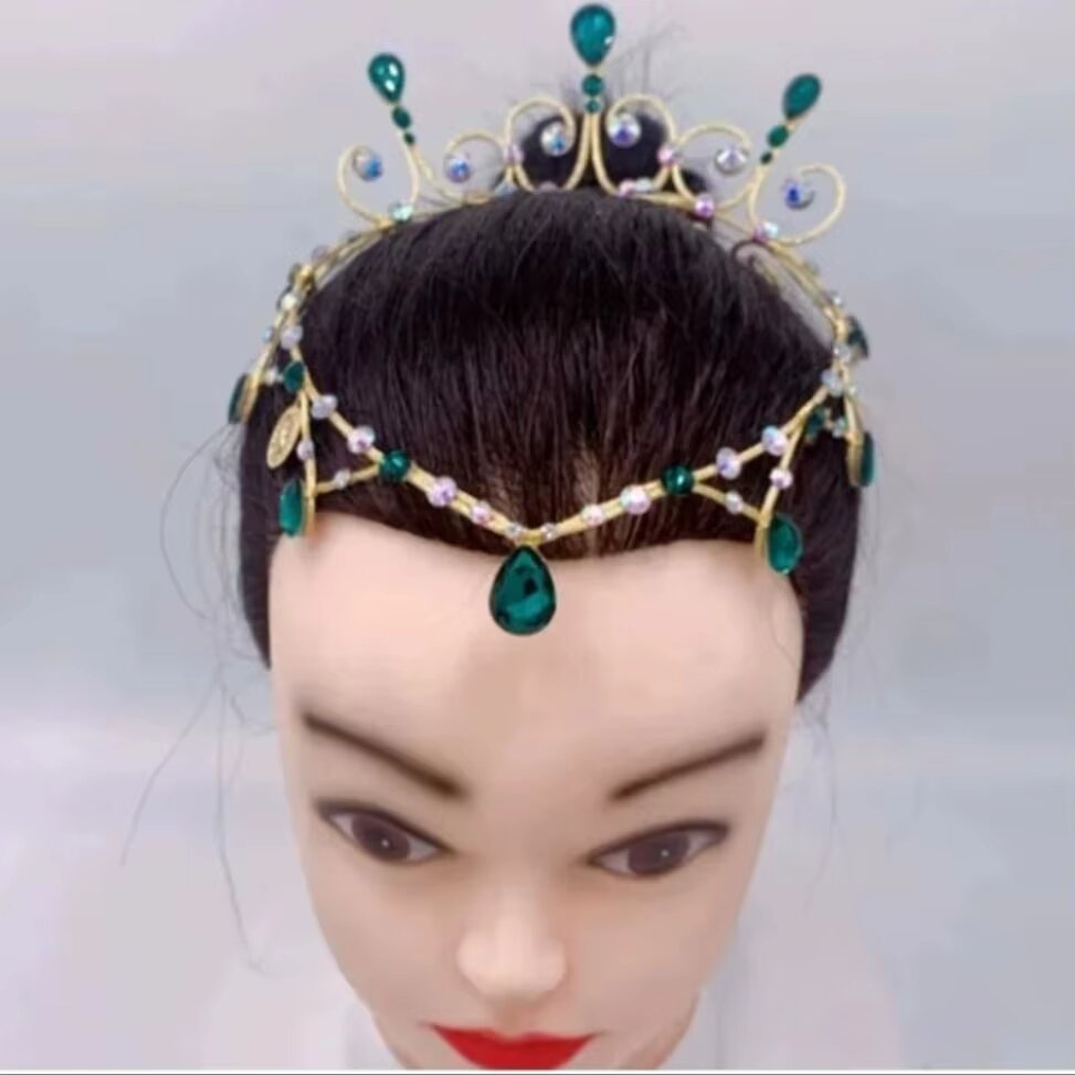 This "gipsy style" tiara is made on a golden frame and features golden beads and green crystals. A beautiful green stone in shape of a tear drop completes the look of this impressively unique tiara.