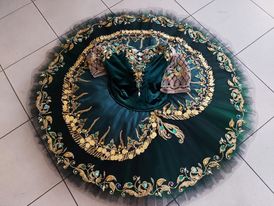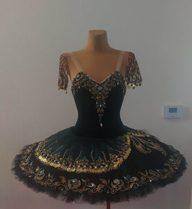 The 10 layers, hooped professional pancake tutu is also dark green. On top of the tulle there is a deep green organza overlay decorated with hundreds of golden coins, crystals, gold appliques and sparkles. The edges of the tutu are decorated in the same way.