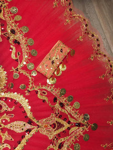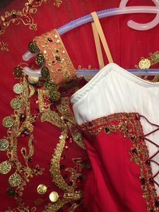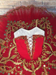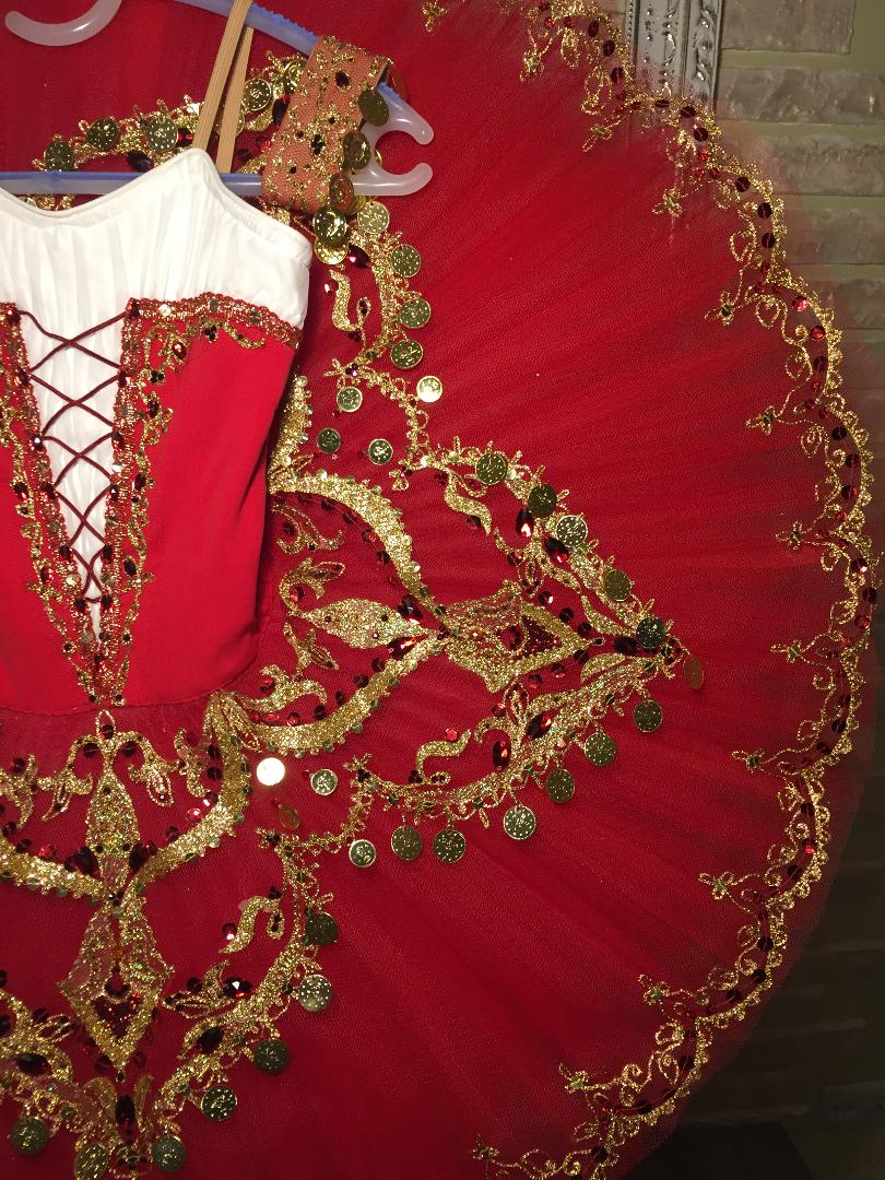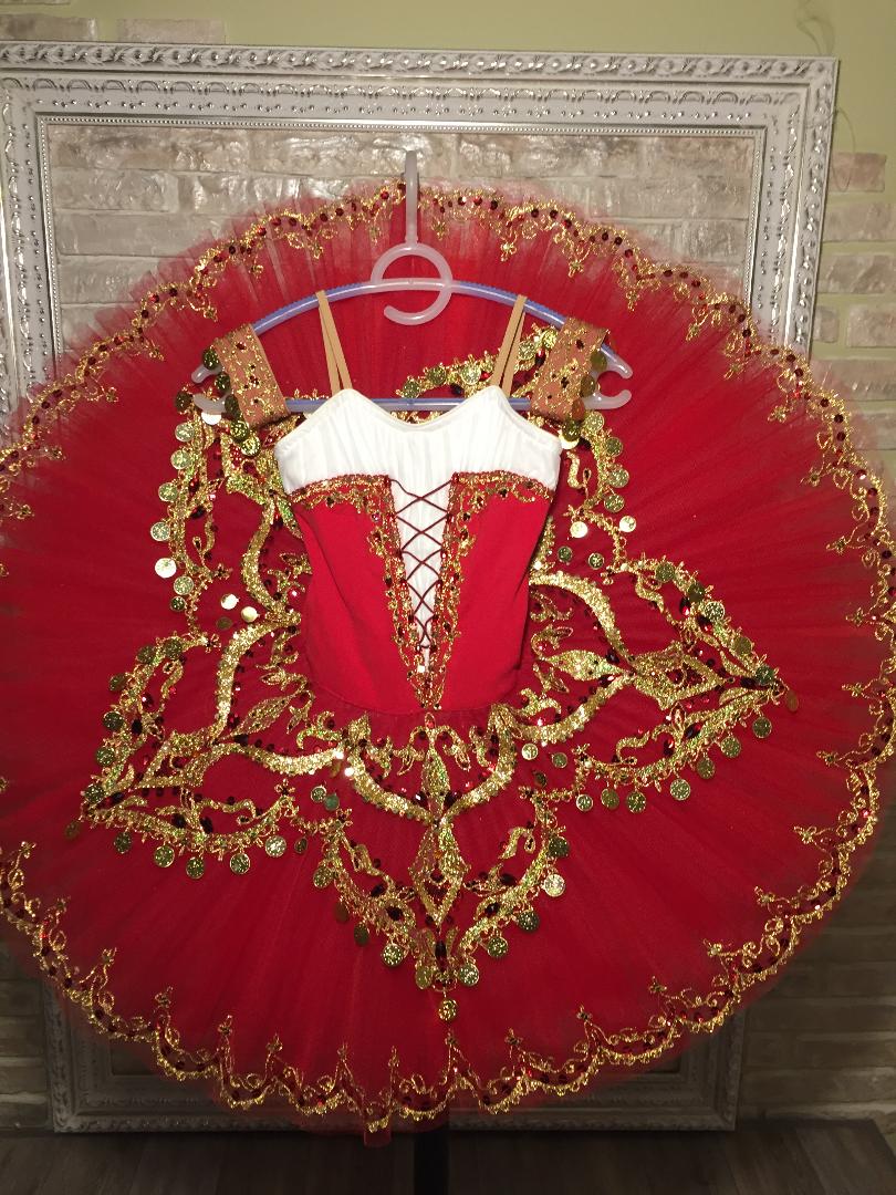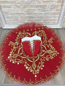 The professional pancake tutu skirt is red, with golden appliques, trims, red crystals and gold coins as decoration.