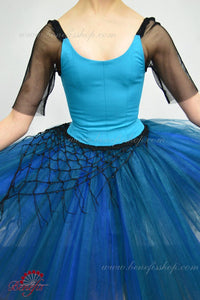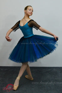 The blue bodice is made of semi-elastic fabric and features a flattering round neck.