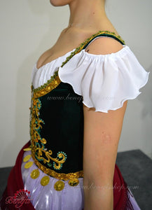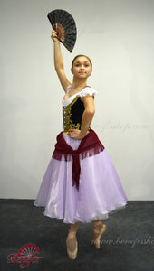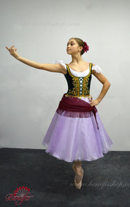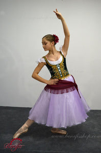 Charming Esmeralda costume made as a Romantic tutu. The top of the costume features a typical black corset with lacing and rich gold decoration. There is a white undershirt with puffy sleeves to complete the peasant look of this professional stage costume. The tutu skirt is pale lilac and creates a strong and beautiful contrast. A deep red scarf to be worn on the hips as shown in the picture embellishes this wonderful stage dress.