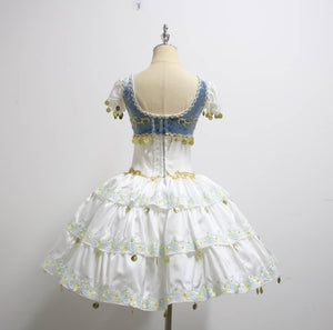 The Romantic length tutu skirt is made with white tulle, while the first layer is in white satin, featuring three different level. Each level is decorated with golden coins and lace.