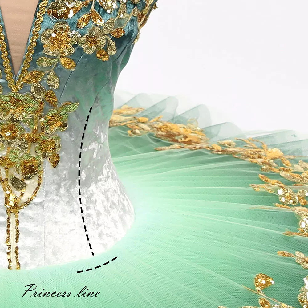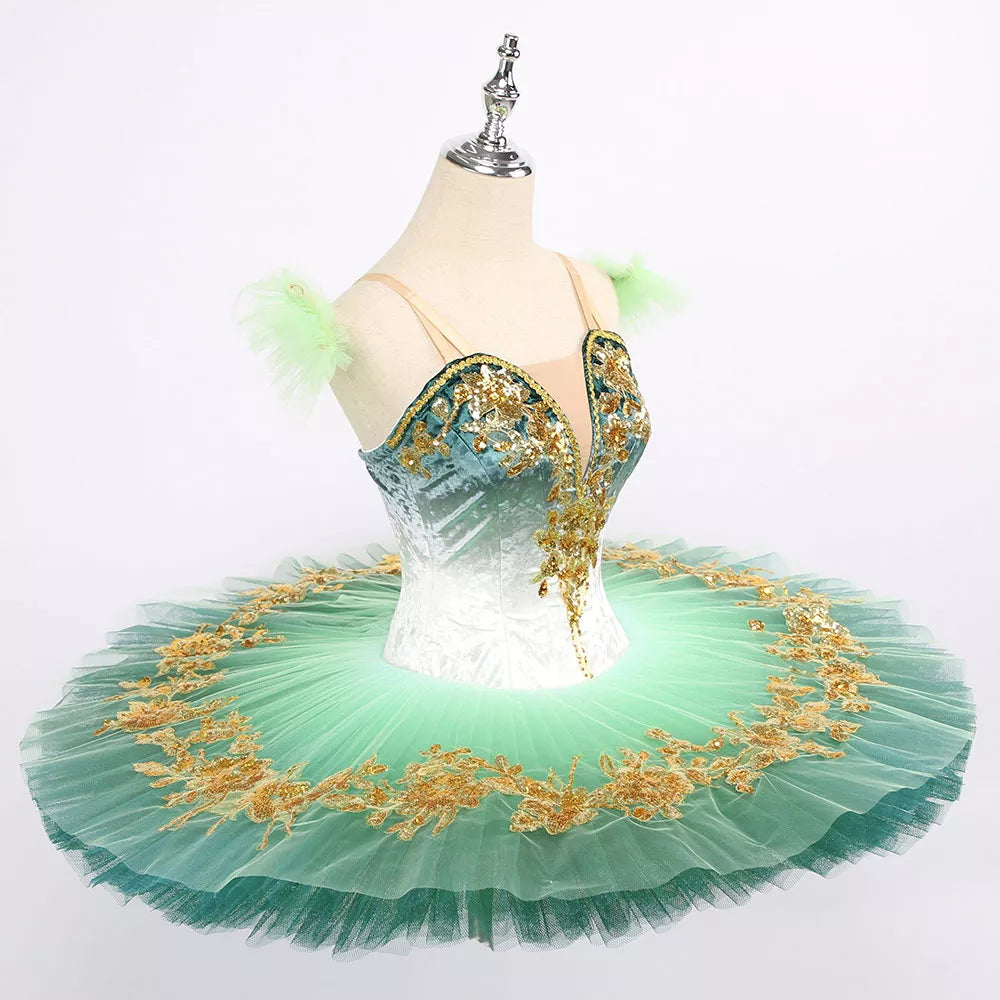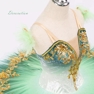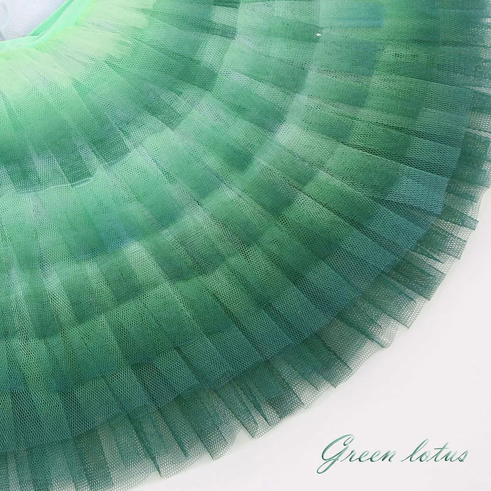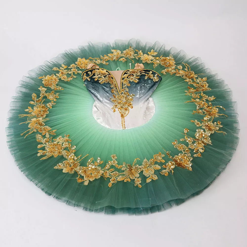 The pancake tutu skirt is also ombre, and starts with a light shade of green towards the hips, and gradually becomes darker green. Embellishments on the skirts are made with gold appliques, and sparkles.