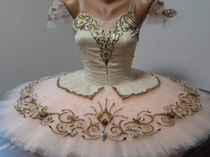 The professional, 10 layers ballet skirt is made with peach net and is richly decorated with gold appliques, sequins and over a hundred Swarovski crystals.