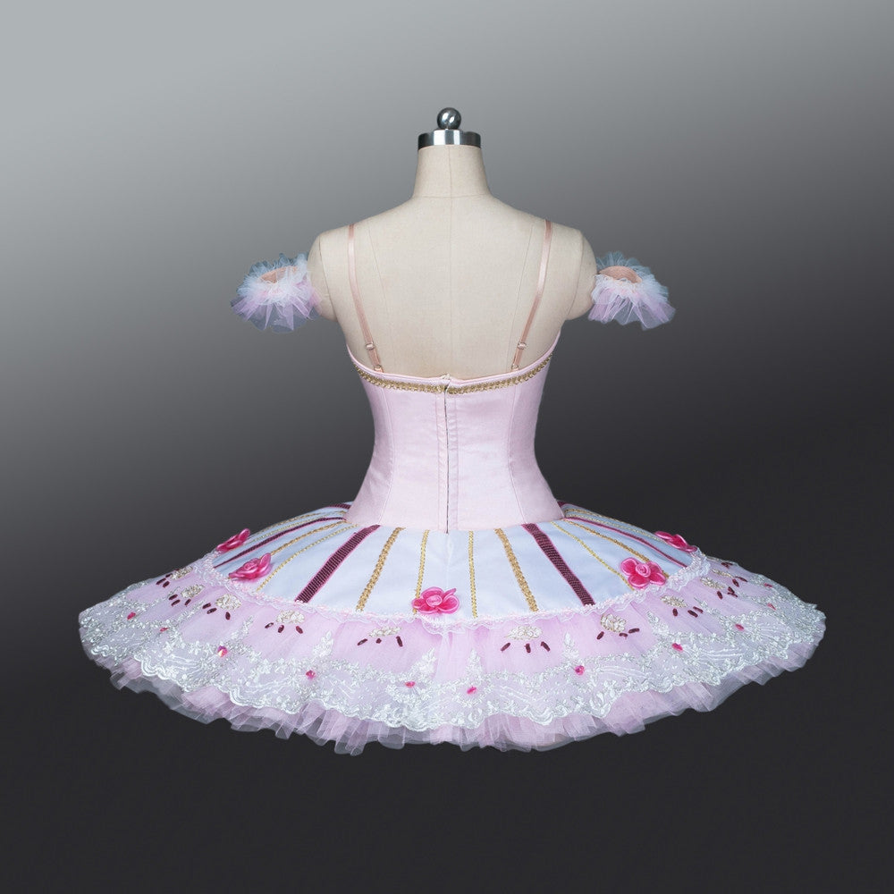 The professional, 12 layers golden yellow tutu skirt is embellished with the same appliques as the bodice, as well as sparkles.
