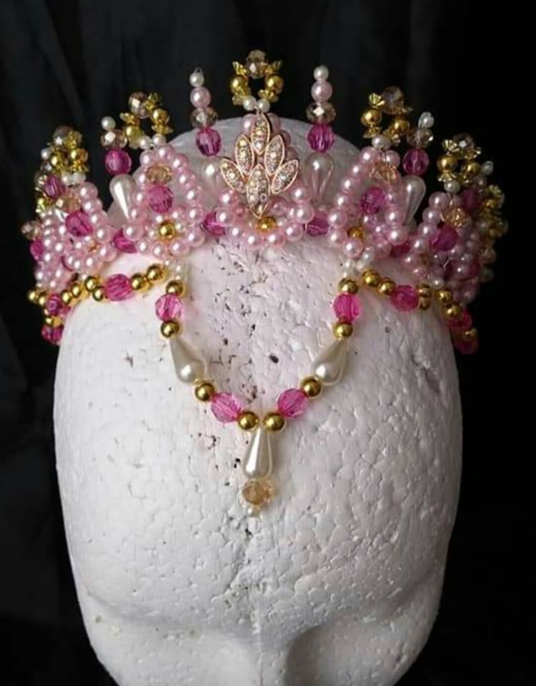 The bodice is made with pink velvet, and fastens in the back with a double row of hooks and eyes. It is entirely decorated with silver and gold trims, sequins and crystals.