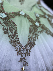 The bodice of this tutu is made with pale green semi stretchy fabric, and features decorations with grey lace, crystals and pale green flowers. Nude insert. The professional tutu skirts presents graded shades of green fading to white, for an impressive effect. The tutu skirt is pale green, matching the bodice. The decorations are made with pale green flowers, sparkles and grey lace in a geometrical pattern.