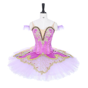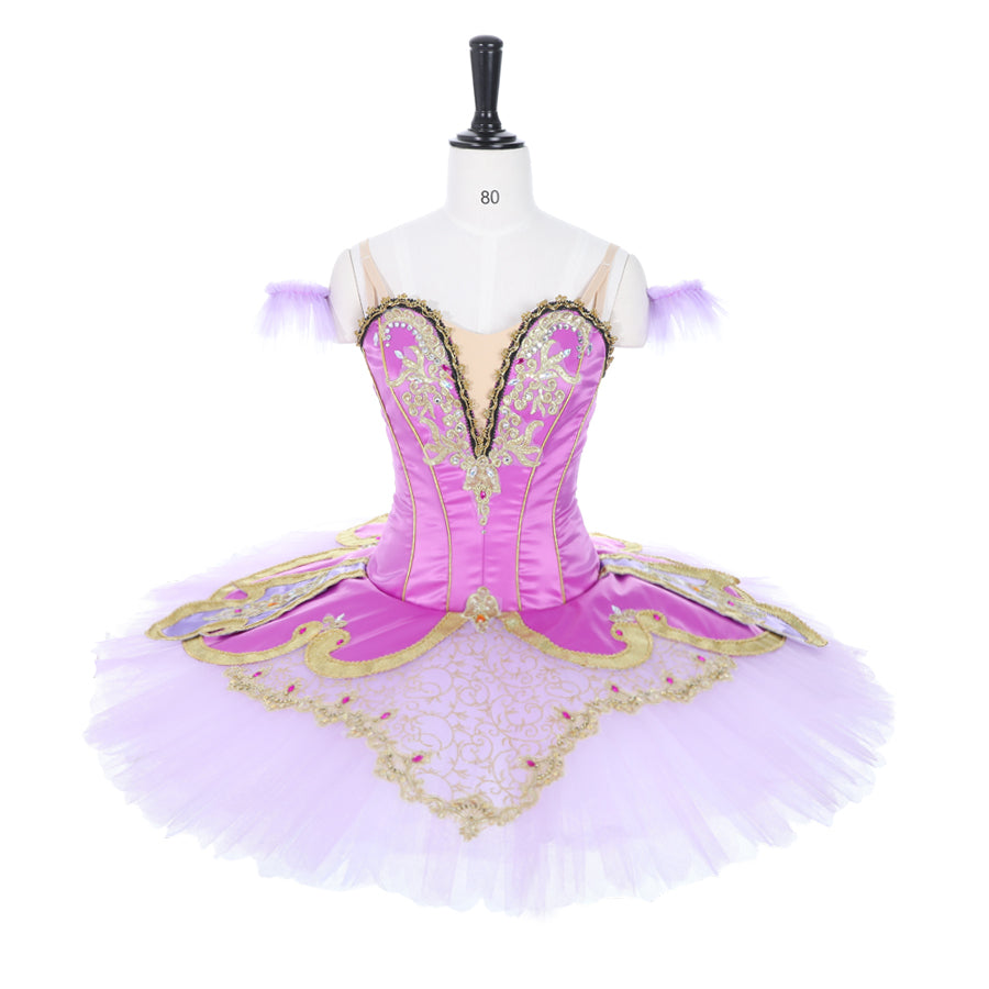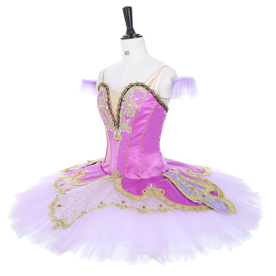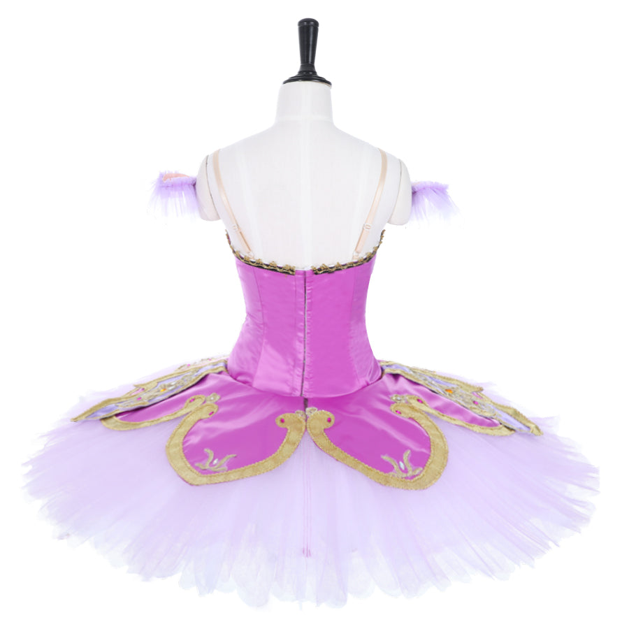 The bodice of this tutu is deep lilac and features a deep nude insert, black trims and rich gold decorations with appliques and crystals.