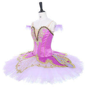 The 10 layers professional tutu skirt is white, with a flower-shaped lilac satin tutu skirt and a golden glitter overlay. Trims, appliques and crystals are scattered all around the skirt.